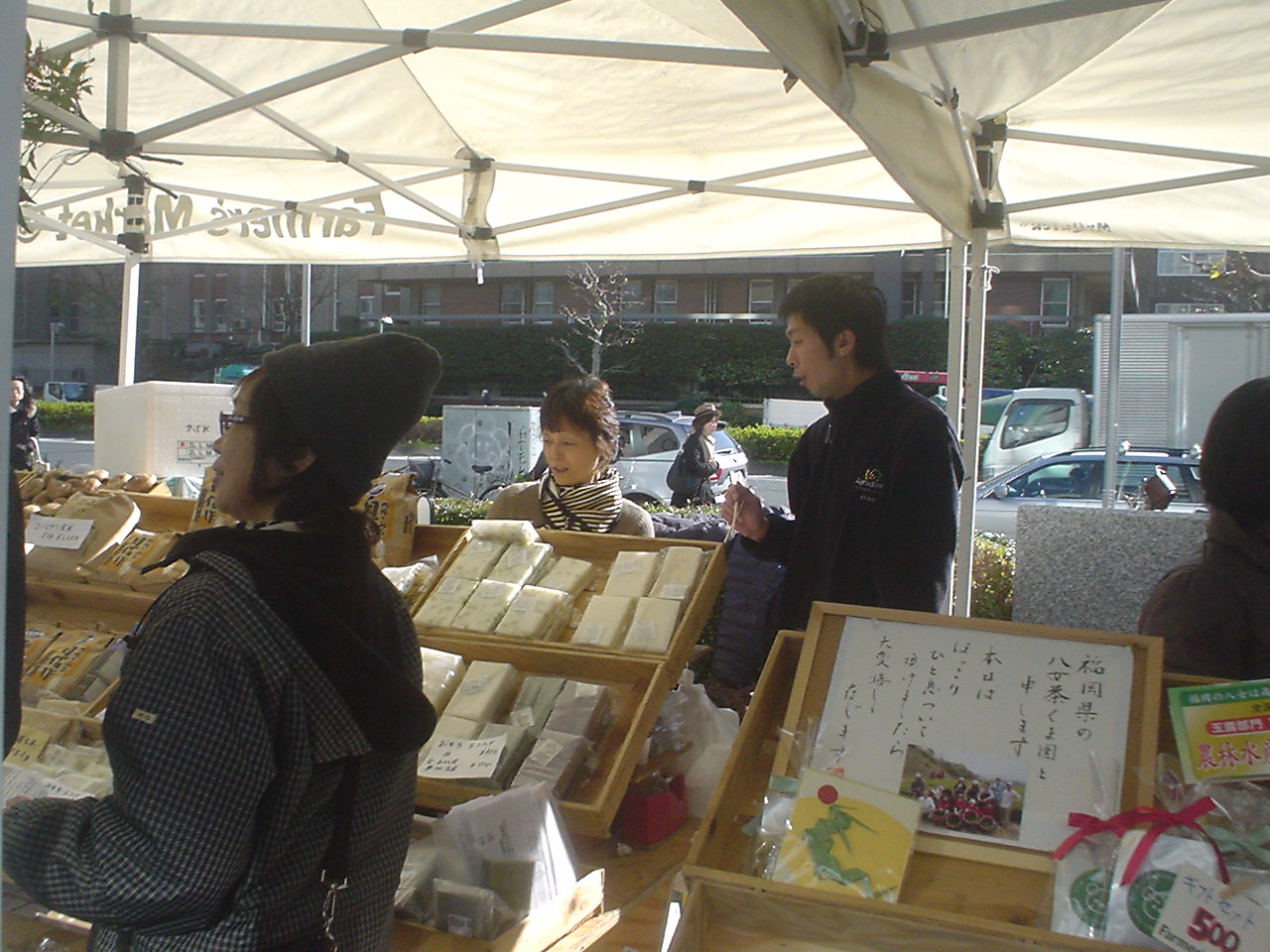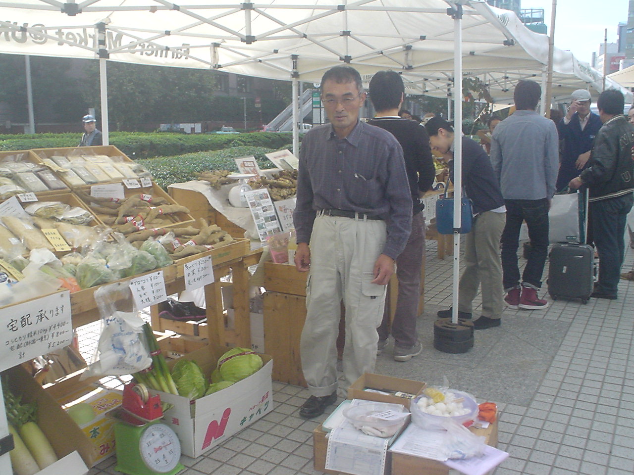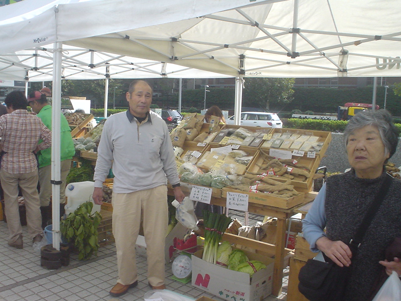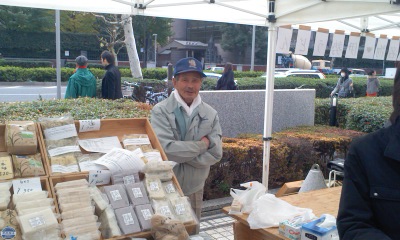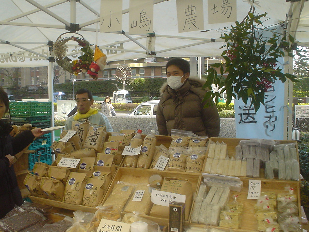 | 三回目11月19日一彦と 雨降りのせいかお客さんの数も少ないようだ。でもありがたいことには前回、前々回に来ていただいたお客さんが忘れずにまた来てくれたことだ。 お客さんは電車あるいは徒歩でくるもので持ち帰りの都合で重いものは買い控える。そのうえ雨降りとなると片手に傘。外人(たぶんアメリカ)の男性に米を買っていただいた。英語で話しかけられるので即座に答えることができなかったが、多分こう言いたかったのだろう。お土産に買って帰るのだけれどご飯を炊く際に『米と水の割合は何対何にしたらいいのか?』と |