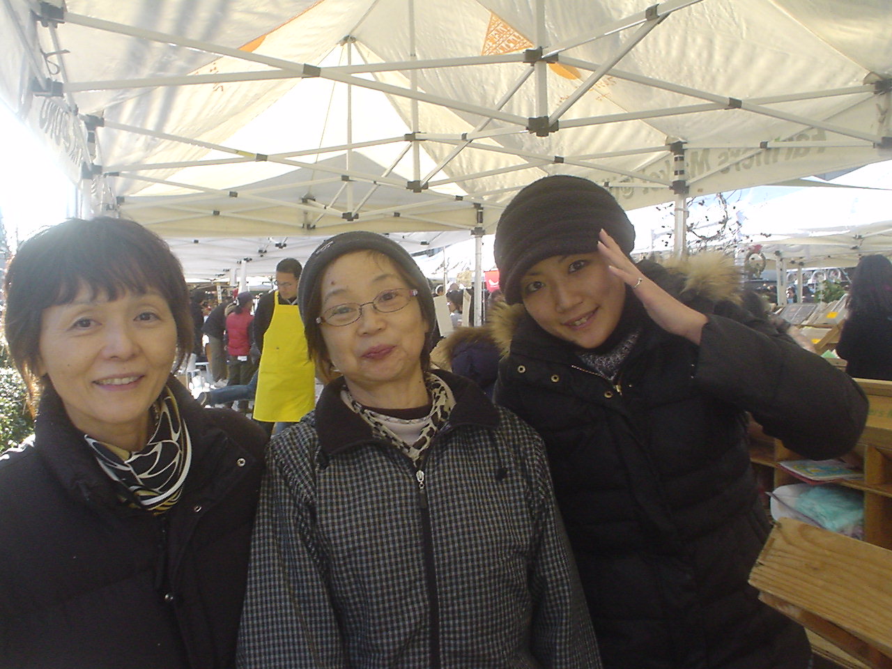 | 四回目11月26日妹たちが聞きつけて駆けつけてきてくれた。天気が良かったこともありお客さんの出足も良くおかげで今までになくよく売れた。姪等が威勢の良い声で客を呼び応対してくれるのも大いにプラスになった。そして前からよくご贔屓にしてくださるお客さんがカラー刷りのパンフレットをこしらえて小嶋農場のアピールのために持ってきてくださった。その方はフードコーデネーターの浜田さんとおっしゃる。 みなさん大変ありがとうございました。 |